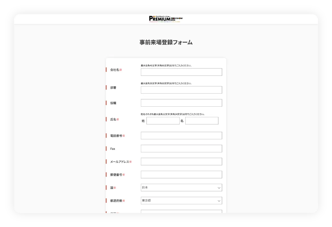 フォーム周りのデザインはカスタマイズ可能!それぞれの展示会に合わせて一部デザインを変更いただけます。 追加料金でフォーム内容のカスタマイズもでき、来場登録とともにアンケートなどの設置もできます。